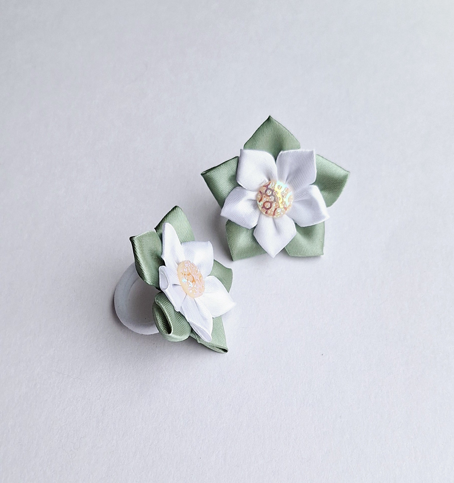 Tvirtai laiko plaukus. Surišus, gėlytę galima švelniai patemti į norimą vietą, nes gėlytė sukasi aplink gumytės žiedą. Dydis ~ 6cm. Viduriukas įvairiai žiba nuo pasukimo kampo.