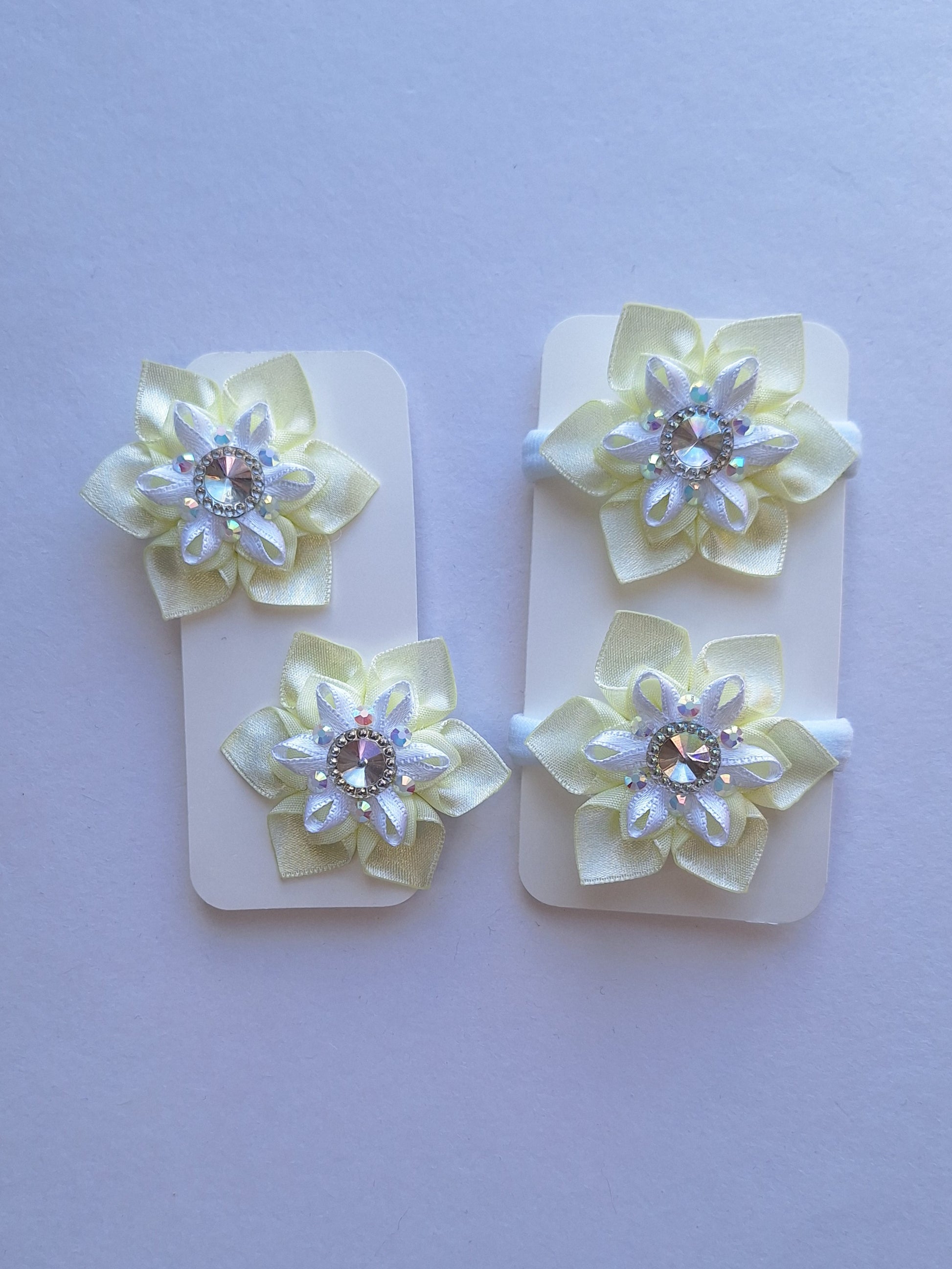 Tvirtai laiko plaukus. Dydis 5×5 cm. Akutės žiba nuo pasukimo kampo. Gumytę surišus galima švelniai patemti į norimą vietą, nes gėlytė sukasi aplink gumytę. Tinka mergaitėms nuo 3+ m.