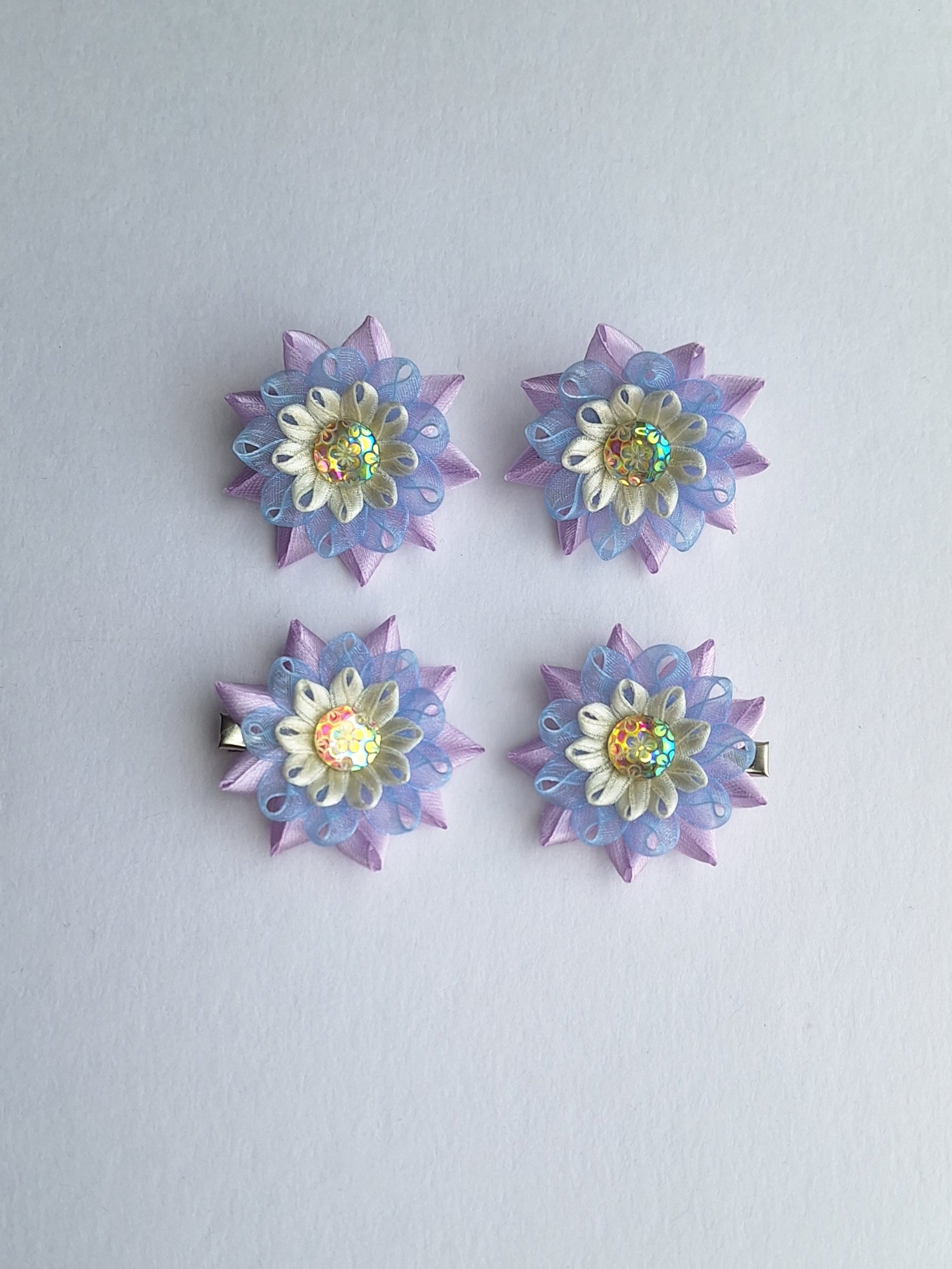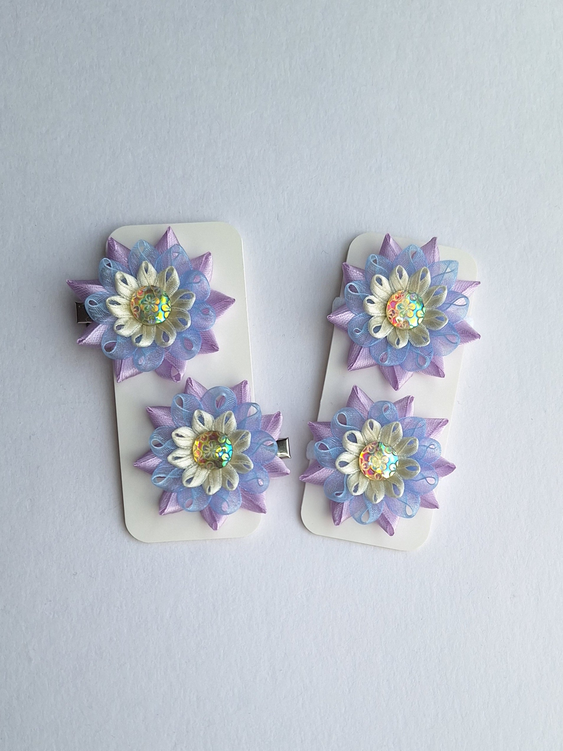 Tvirtai laiko plaukus. Tinka pirmiems plaukučiams. Dydis 5×5 cm. Akutės žėri nuo pasukimo kampo. Gumytę surišus galima švelniai patemti į norimą vietą, nes gėlytė sukasi aplink gumytę.