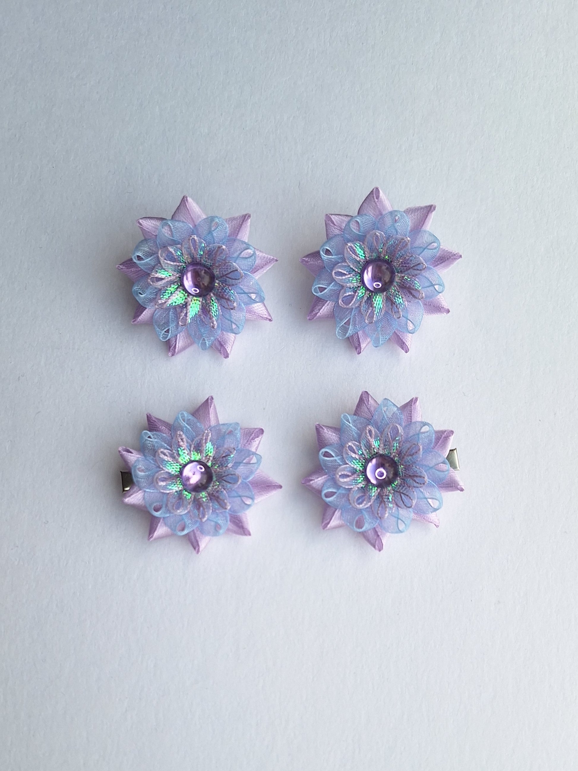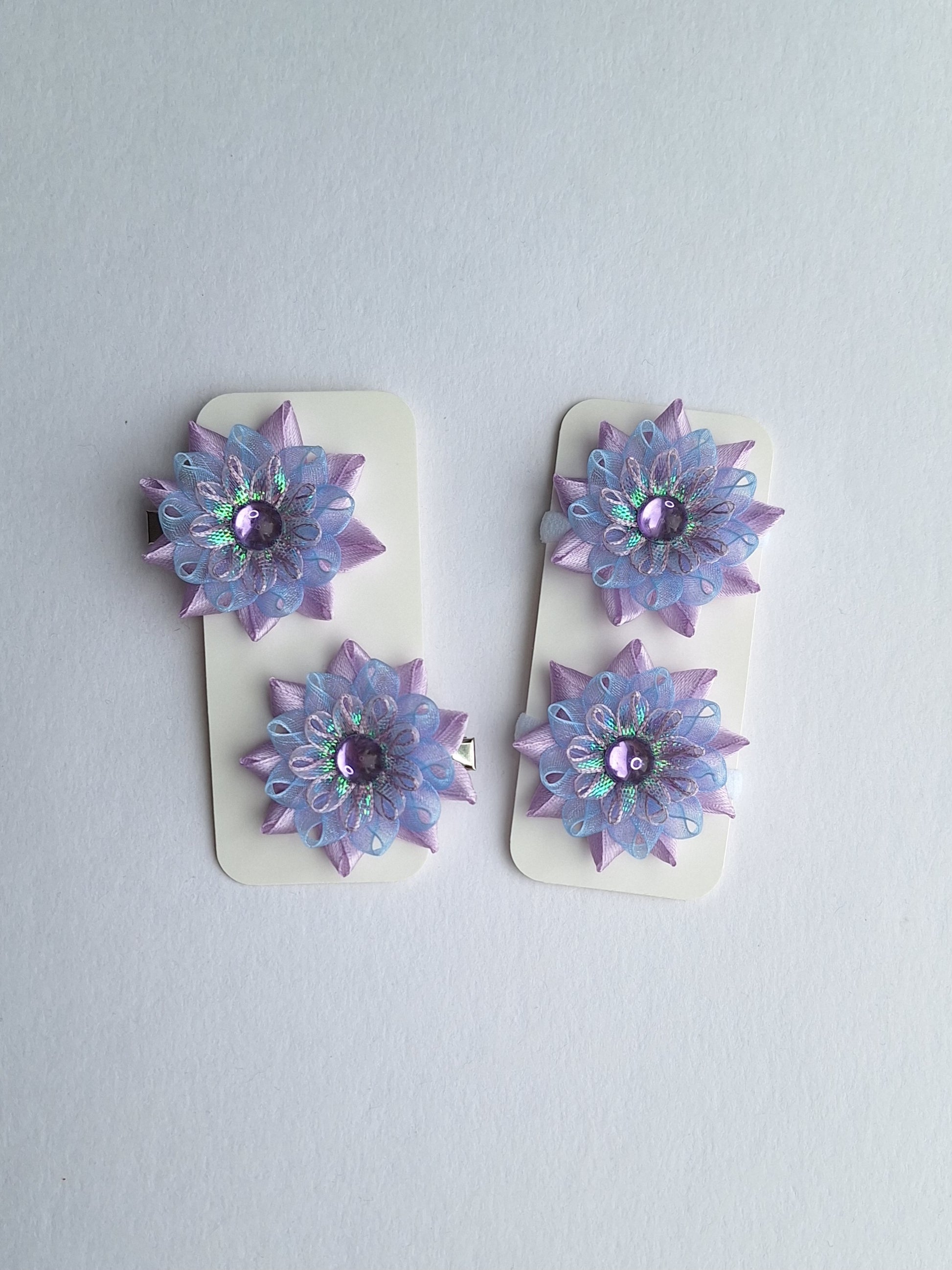 Tvirtai laiko plaukus. Tinka pirmiems plaukučiams. Dydis 5×5 cm. Lengvas. Akutės žėri nuo pasukimo kampo. Gumytę surišus galima švelniai patemti į norimą vietą, nes gėlytė sukasi aplink gumytę.
