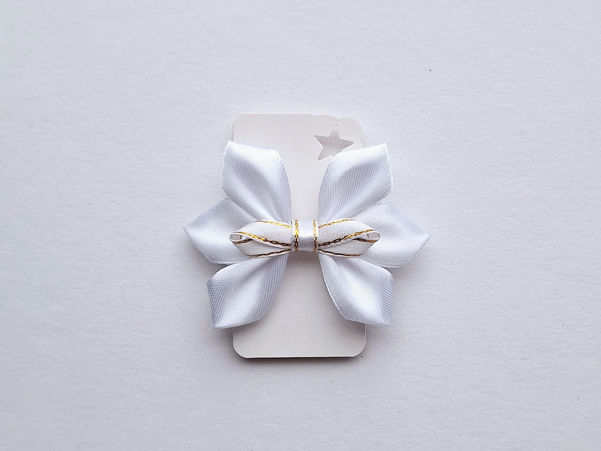 Tvirtai laiko plaukus. Metalinio sagučio dydis 6 cm. Pats kaspinas ~ 5×7 cm.