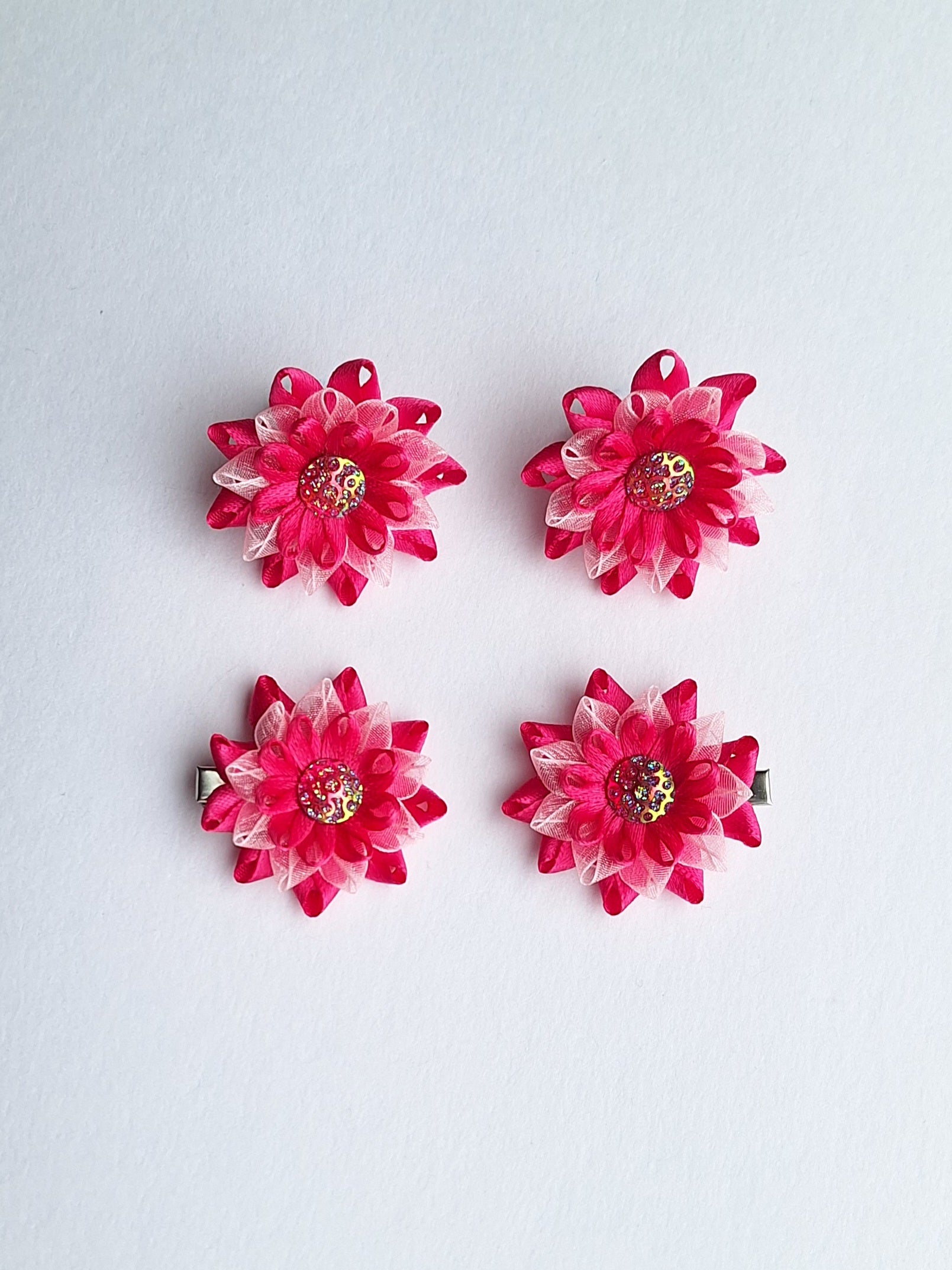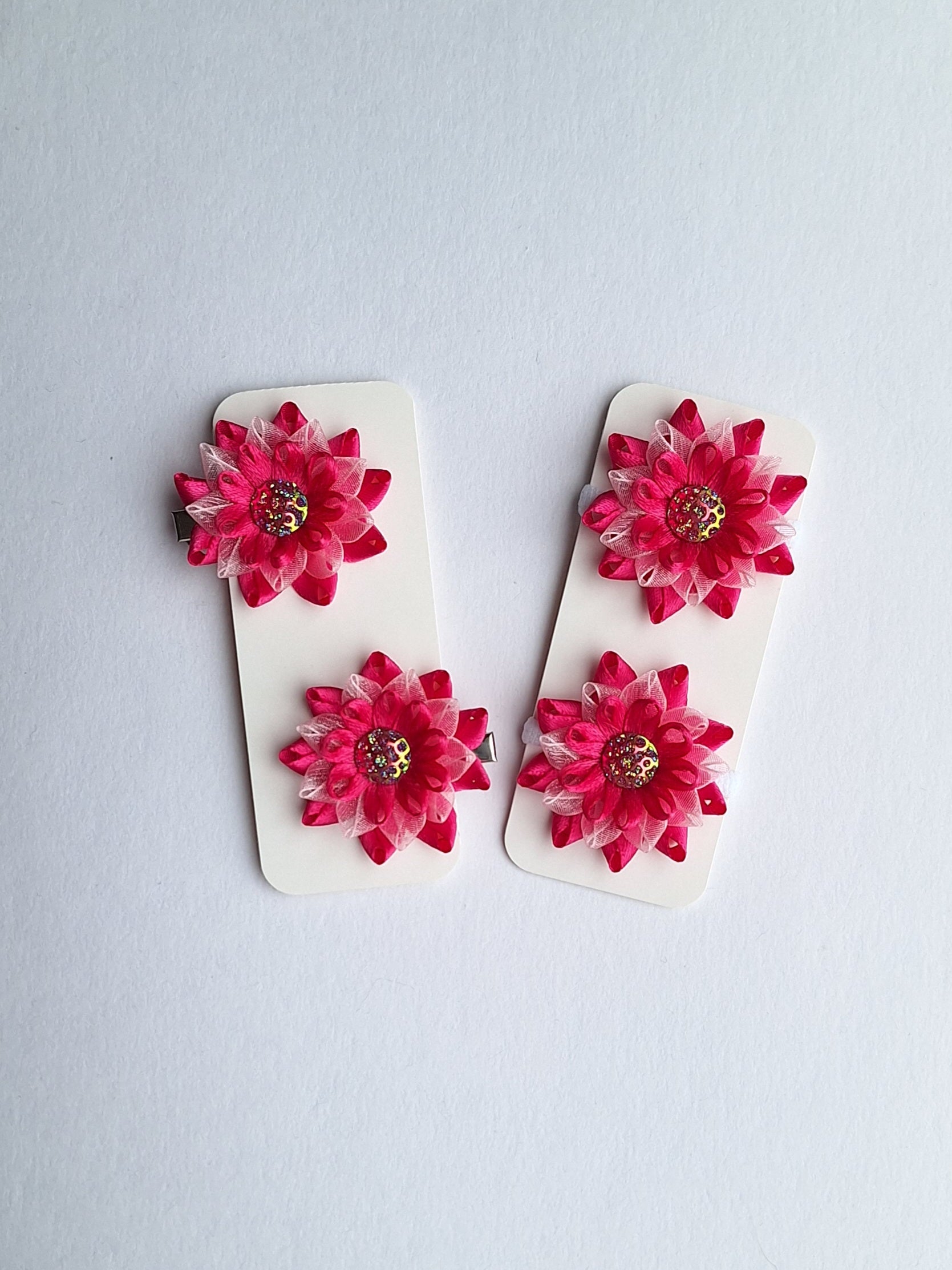 Pirmiems plaukučiams. Tvirtai laiko. Gumytę surišus galima švelniai patemti į norimą vietą, nes gėlytė sukasi aplink gumytę. Dydis ~5 × 5 cm. Lengvi.